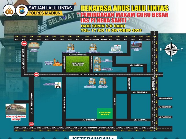 "Betul kami akan lakukan pengalihan arus lalu lintas untuk kendaraan besar dan bus yang biasanya melintas depan Padepokan IKSPI Jalan Letjen Sutoyo, Caruban Madiun. Pengalihan karena ada rangkaian acara pemindahan makam guru besar perguruan silat IKSPI Kera Sakti," ujar Kasat Lantas Polres Madiun AKP Firman Widyaputra kepada detikJatim, Selasa (17/10/2022).