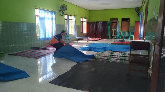 Tampak di posko pengungsian di kantor Kelurahan Sukorejo, petugas melipat karpet dan tikar. Kondisi ruangan sudah kosong karena semua pengungsi kembali ke rumah masing-masing sejak Selasa (18/10/2022) malam.