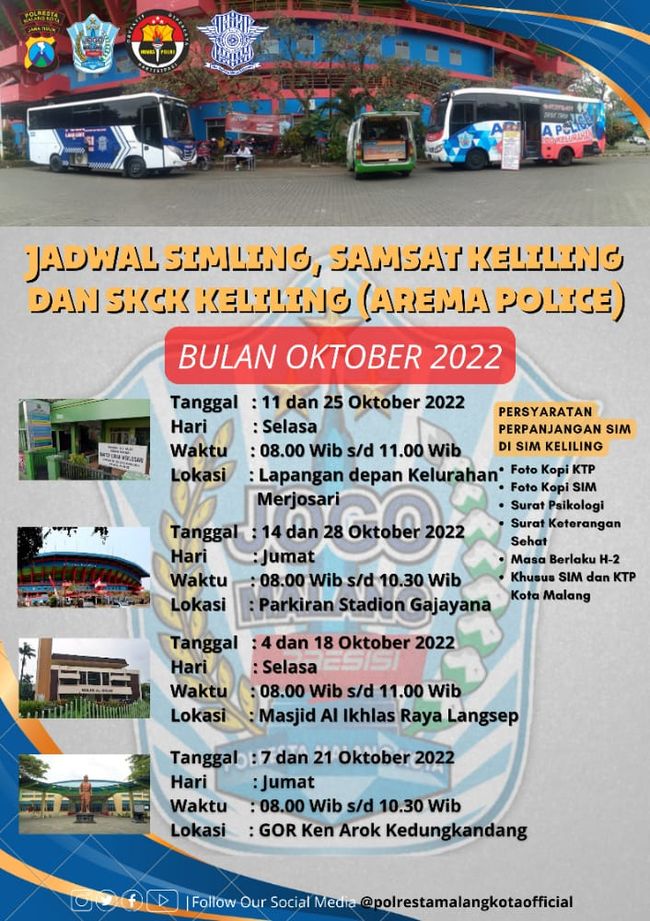 Untuk hari ini Jumat 21 Oktober 2022, mobil SIM keliling Polresta Malang Kota mangkal di GOR Ken Arok Kedungkandang. Jadi warga yang berdomisili di sekitar lokasi tersebut, bisa lebih dekat untuk memperpanjang SIM.