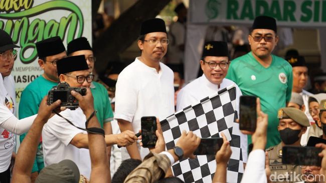 Ketua Umum PKB Muhaimin Iskandar (Cak Imin) mlaku bareng memakai sarung bersama ribuan santri di Sidoarjo. Muhaimin menyebut sudah waktunya santri menjadi pemimpin bangsa.
