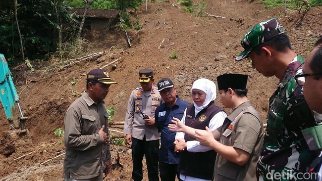 Gubernur Jatim Khofifah Indar Parawansa meninjau langsung lokasi tanah longsor yang menimpa empat rumah di Desa Sumurup, Trenggalek. Pemprov Jatim menyiapkan lahan untuk relokasi.