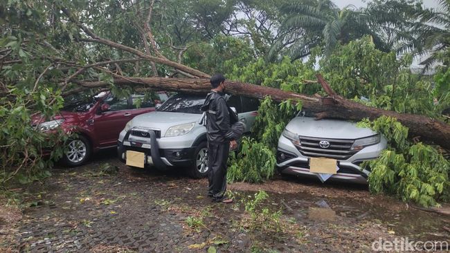 Sebanyak 4 mobil tertimpa pohon tumbang akibat puting beliung disertai hujan deras di Perumahan Kahuripan Nirwana Village (KNV) Sidoarjo. Keempat mobil yang tertimpa pohon itu terparkir di halaman kantor pemasaran Perumahan KNV.