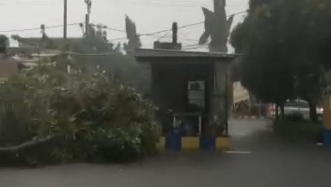 "Kabel-kabel putus, pos satpam hancur-hancur sedikit. Pohon tumbang sak akar-akar e," kata salat satu perekam yang dilihat detikJatim, Minggu (23/10/2022).