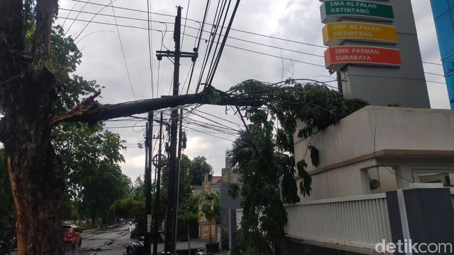 "Ada pohon tumbang di depan SMA Al Falah di Jalan Ketintang Madya dan di Jalan Gunung Anyar Tengah proses pemotongan sudah dilakukan," kata Hebi kepada detikJatim, Minggu (23/10/2022).