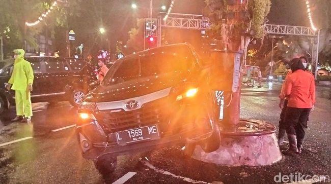 Sebuah mobil Toyota Avanza menabrak tiang di Simpang Empat Jalan Darmo. Akibat kejadian ini arus lalu lintas sempat tersendat.