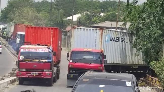 Sedangkan kepala truk melintang dan memakan bahu jalan. Akibatnya, kendaraan lainnya yang akan melintas harus bergantian sehingga memicu kemacetan panjang.