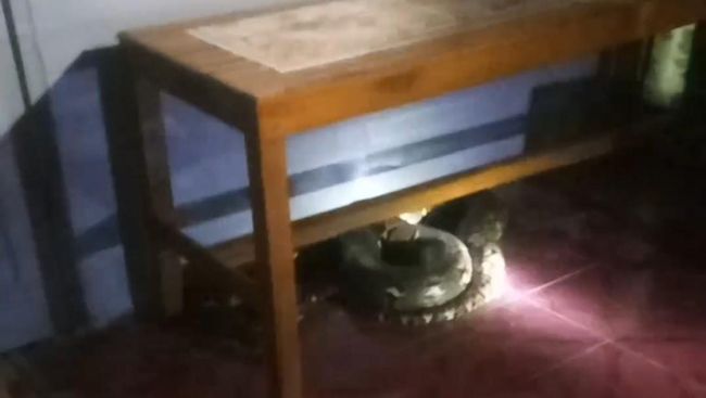 Seekor ular piton ditemukan ngumpet di bawah meja teras rumah warga di Jalan Lamongan, Yosowilangon, Kebomas Gresik. Pemilik rumah yang mengetahui panik dan menghubungi petugas damkar setempat.