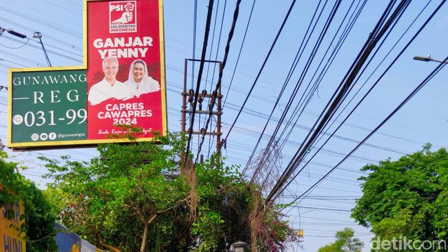 Baliho Partai Solidaritas Indonesia (PSI) bergambar Ganjar Pranowo-Yenny Wahid di Gresik bermasalah. Baliho tersebut belum mengantongi izin.