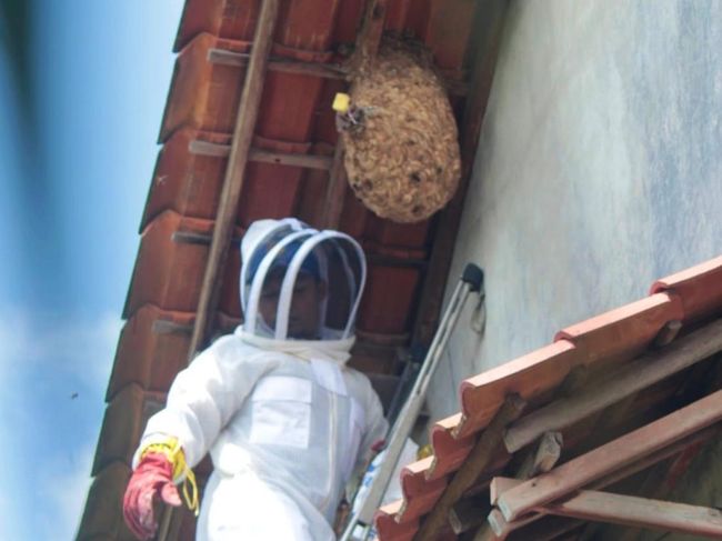 Lokasi bersarangnya Tawong Gung, lanjut Sutikno, sempat menyusahkan proses evakuasi. Karena berada di atap dengan ketinggian dua lantai. Petugas pun menyusun anak tangga untuk menjangkau sarang Tawon Gung itu.