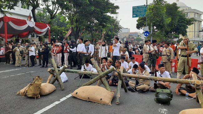 "Barusan pembukaan jalan, diikuti anoa ranput dari TNI dan paskibraka Surabaya diikuti jajaran forkopimda wali kota dan wawali Surabaya menaiki kuda dan diikuti jajaran istri jeep dan diikut barisan 90 veteran," kata pembawa acara.
