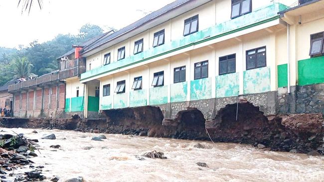 Gedung SMP Islam Munjungan, Trenggalek terancam roboh akibat dihantam banjir bandang. Sebagian pondasi bangunan hilang tergerus banjir.