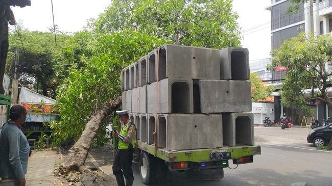 Sebuah pohon mojo tumbang menimpa truk muat beton gorong-gorong di Pertigaan Transmart Ngagel, Surabaya. Tumbangnya pohon setinggi 25 meter ini lantaran tersangkut crane truk bernopol S 8674 NG.