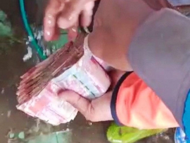 Penemuan segebok uang itu viral setelah video berdurasi 30 detik tersebar di media sosial, Minggu (7/11). Dalam video itu, sejumlah relawan sedang mencuci segepok uang pecahan Rp 100 ribu rupiah.