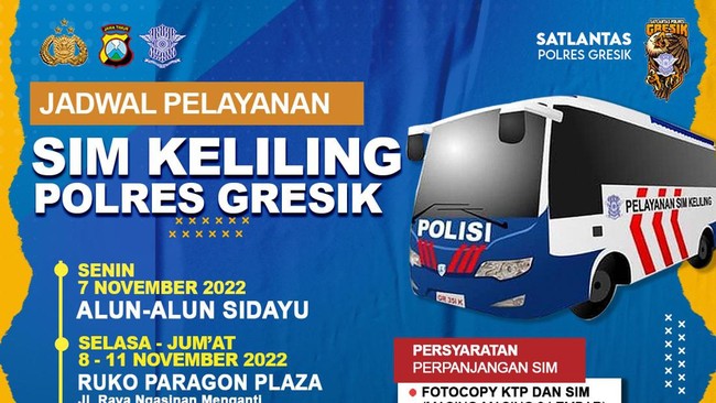 Hari ini Kamis 10 November 2022 Mobil SIM Keliling di Gresik akan melayani perpanjangan SIM di Ruko Paragon Plaza, Jalan Raya Ngasinan, Menganti.