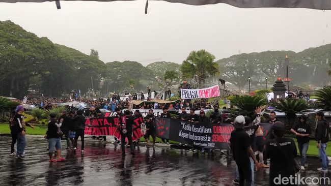 Hujan terus mengguyur tak menyurutkan massa aksi untuk menggelar tahlil untuk 135 korban meninggal Tragedi Kanjuruhan.