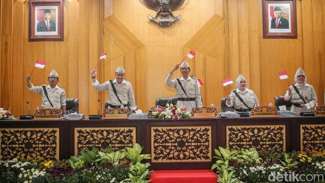 Sebelum akhir Rapat Paripurna, Ketua DPRD Kota Surabaya Adi Sutarwijono dan Wali Kota Eri Cahyadi mengajak semua yang hadir untuk menyanyikan lagu Kebyar-Kebyar, karya almarhum Gombloh.
