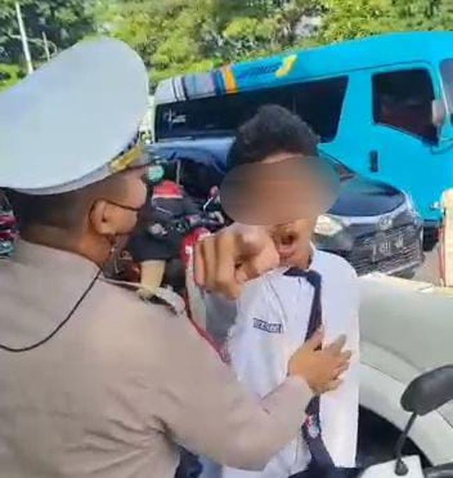 Dalam video tampak awalnya seorang polisi tengah menghentikan dan memberi teguran kepada siswa tersebut karena tak memakai helm. Siswa yang ditegur juga tampak membonceng seorang siswi.