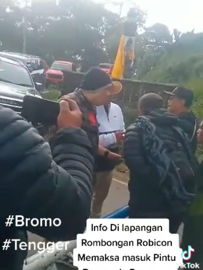 Rombongan mobil Jeep Rubicon cekcok dengan petugas TNBTS di kawasan wisata Bromo, wilayah Pakis Binjil, Desa Wonokitri, Kecamatan Tosari, Kabupaten Pasuruan. Rombongan Rubicon itu tak diizinkan masuk ke Bromo sehingga jalan ditutup portal.