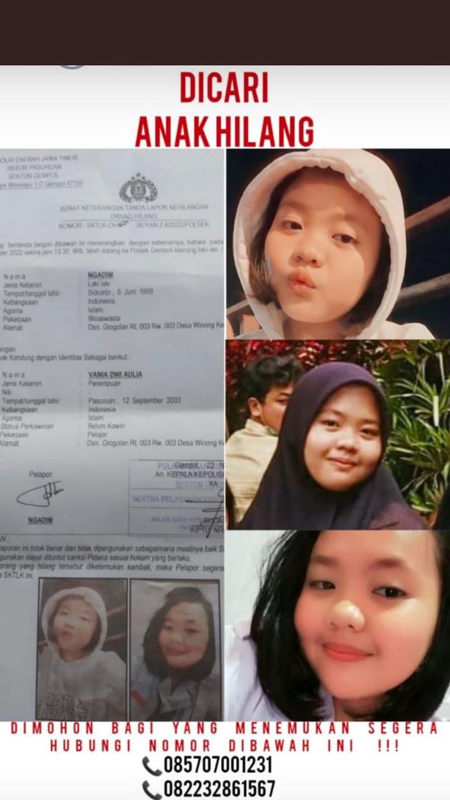 "Ponakan saya itu panggilannya Vania. Nggak papa fotonya ditampilkan, biar kalau ada orang yang tahu bisa mengabarkan ke kita," kata Fandi, Rabu (23/11/2022).