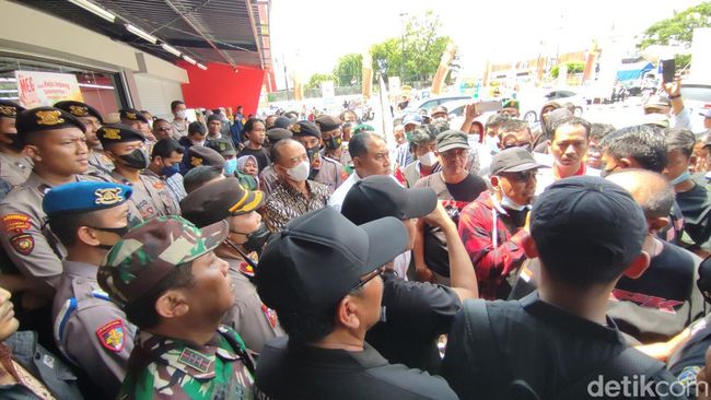 Massa yang berada di depan swalayan ingin masuk dan bertemu dari pihak manajemen untuk meminta bukti perizinan bangunan. Namun aksi itu dihalangi oleh aparat kepolisian.