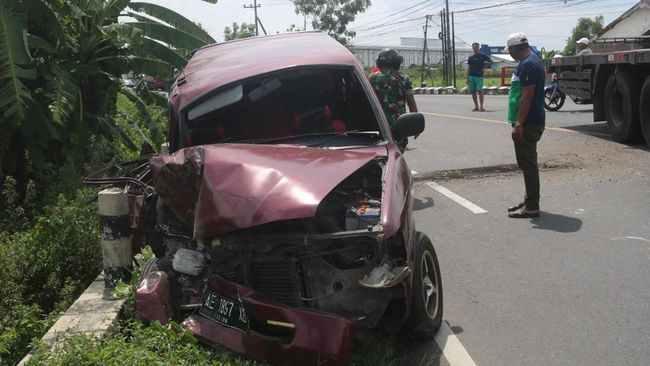 Mobil Toyota Kijang memuat satu keluarga menabrak truk kontainer. Kecelakaan terjadi di jalur arteri Dusun Ngemplak, Desa Pagerwojo, Perak, Jombang.