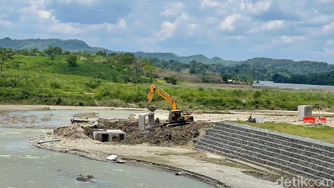 Karena meluap, pekerja proyek kemudian menjebol waduk yang juga menjadi jalan di atas waduk. Ini agar air bisa mengalir dan tak meluap ke mana-mana.