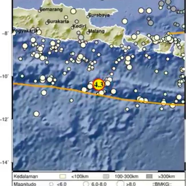 Kemudian pukul 13.49.12 WIB gempa susulan terjadi M 4,3. Lokasi gempa Jember 10.63 Lintang Selatan (LS), 113.35 Bujur Timur (BT) dan di 272 KM Barat Daya Jember, dengan kedalaman 10 Km.