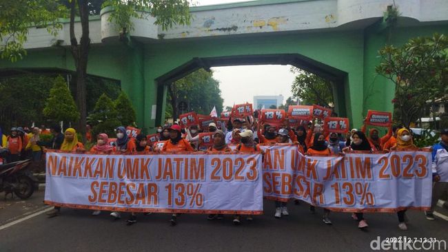 Pemerintah Provinsi Jawa Timur (Pemprov Jatim) telah resmi menetapkan Upah Minimum Kabupaten/Kota (UMK) 38 daerah tahun 2023. Namun, angka yang ditetapkan pemprov itu tak sesuai harapan buruh. Para buruh yang kecewa telah menyiapkan aksi besar hari ini.