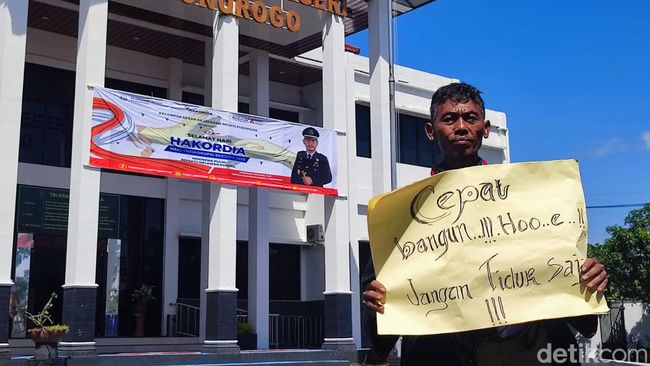 Dalam aksinya, pria 55 tahun itu membentangkan poster bertuliskan 'Cepat bangun hoe! Jangan tidur saja'. Poser itu dimaksudkan agar Kejari Ponorogo tegas memberantas kasus korupsi.