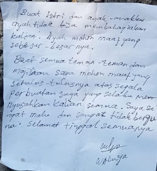 "Surat wasiat itu ditujukan oleh anak-anaknya dan istri, serta majikan dan teman pekerjaan, intinya korban minta maaf," lanjut Yani..