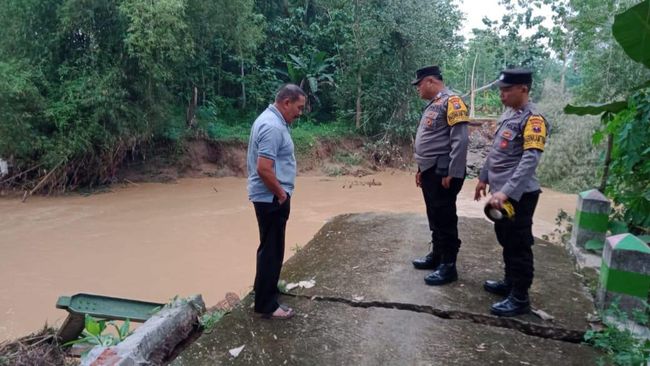 "Jadi setelah ambruk satu bulan yang lalu itu masih ada slingnya, sehingga kemarin itu, rumpun bambu nyangkut ke situ dan menyeret pondasi utama jembatan," jelasnya.