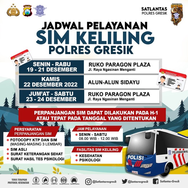 Seminggu ini mobil SIM keliling Polres Gresik akan melayani perpanjangan SIM warga Gresik. Di mana saja mobil SIM keliling mangkal selama seminggu ini?