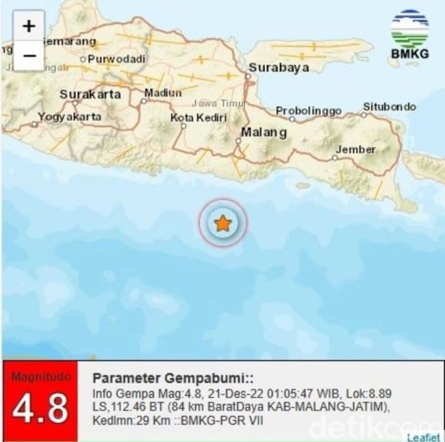 Dalam kurun waktu 8 jam, terjadi gempa dua kali di Kabupaten Malang-Jatim. BMKG mencatat gempa terjadi pukul 00.00 WIB dan pukul 01.05 WIB, Rabu (21/12/2022).