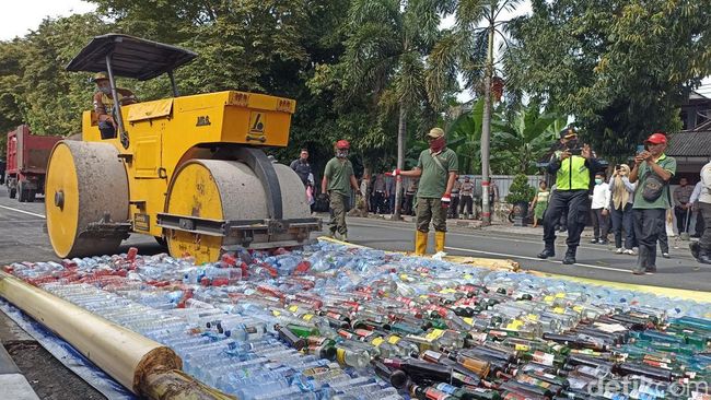 Ribuan botol minuman keras (miras) dari berbagai jenis dimusnahkan di halaman Mapolres Blitar Kota. Pemusnahan dilakukan dengan alat berat.
