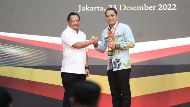 Wali Kota Surabaya Eri Cahyadi menerima penghargaan Kota Terinovatif dari Mendagri di Jakarta, siang tadi. Kali ini, penghargaan yang diraih Surabaya terkait inovasi perekonomian dan kesehatan di Kota Pahlawan.