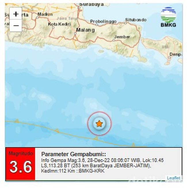 Gempa terjadi di Jember. Gempa terjadi dua kali dengan selisih waktu hanya beberapa menit pukul 08.00 WIB, Rabu (28/12/2022).
