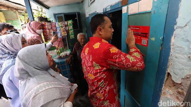 Wali Kota Surabaya Eri Cahyadi memasang stiker di rumah warga miskin atau keluarga penerima manfaat (KPM) bansos. Eri secara simbolis memasang stiker itu di rumah di Gubeng Klingsingan.