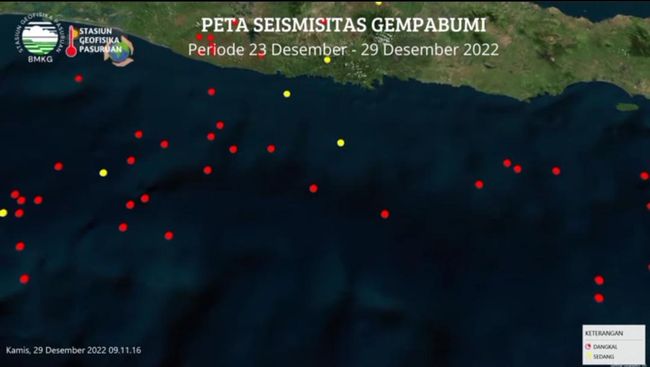 BMKG Stasiun Geofisika (Stageof) Kelas II Pasuruan mengeluarkan data kompilasi gempa selama sepekan terakhir pada periode 23-29 Desember 2022. Pada periode itu terdeteksi 63 gempa di Jatim.