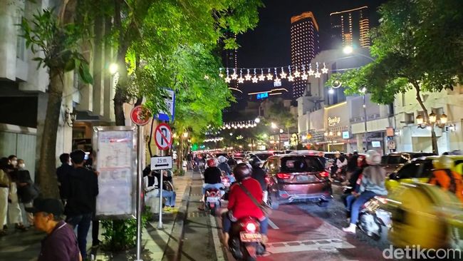 Pedestrian di sisi kiri dan kanan jalan tersebut juga dipadati banyak orang. Sejumlah pejalan kaki maupun pengendara motor sudah ada yang saling bersahutan meniup terompet tahun baru. Ingar bingar sudah terasa 3 jam sebelum tahun berganti.