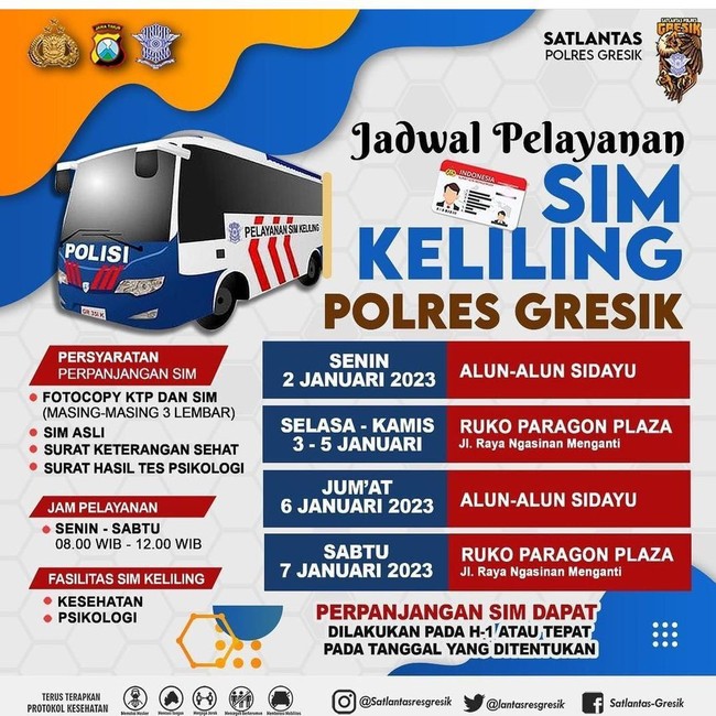 Layanan SIM keliling Polres Gresik kembali menyapa warga di tahun baru 2023. Di mana saja mobil SIM keliling akan mangkal seminggu ke depan?