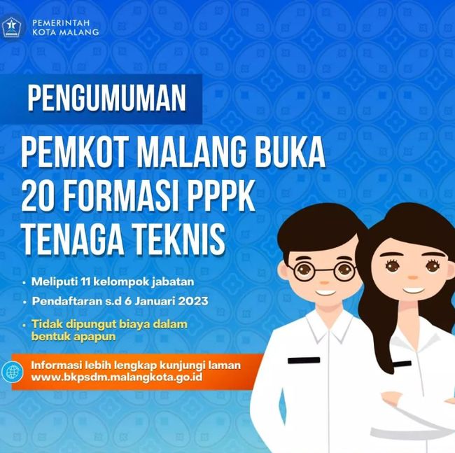 Pengumuman lowongan ini dapat dilihat di laman resmi https://bkpsdm.malangkota.go.id/, dengan waktu pendaftaran mulai 21 Desember 2022 sampai 6 Januari 2023. Hasil seleksi administrasi akan diumumkan mulai 12-15 Januari mendatang.
