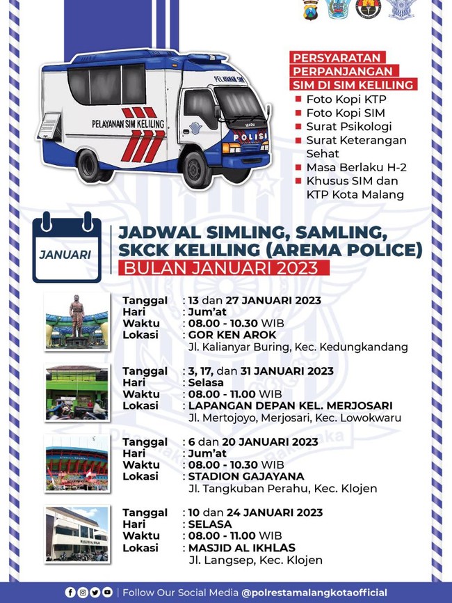 6 dan 20 Januari mobil SIM Keliling mangkal diStadion Gajayana di Jalan Tangkuban Perahu, Klojen