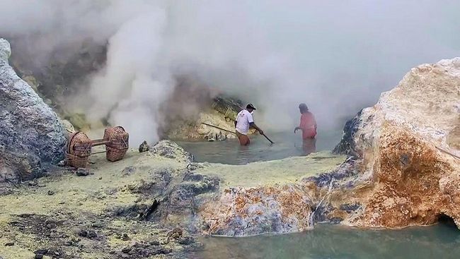 Para penambang itu dengan santainya turun ke dapur belerang. Bahkan dalam video yang beredar, sejumlah penambang nekat mengarungi danau kawah dengan perahu getek.