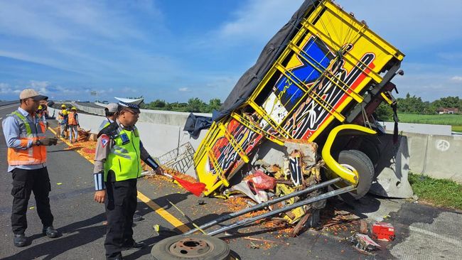 Kecelakaan tunggal terjadi di Tol Jombang-Mojokerto. Truk menabrak barier atau pembatas jalan hingga remuk. Sopir diketahui tewas.