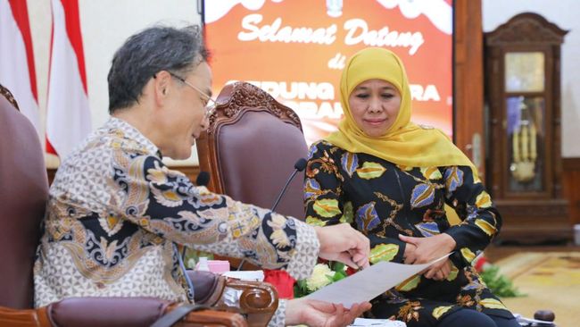Tim Representative Japan Internasional Coorporation Agency (JICA) Yasui Takehiko berkunjung ke Surabaya untuk menemui Gubernur Jatim Khofifah Indar Parawansa di Gedung Negara Grahadi. Badan kerja sama internasional Jepang itu hendak melakukan Feasibility Study (FS) atau studi kelayakan Mass Rapid Transportation (MRT) di Kota Pahlawan.