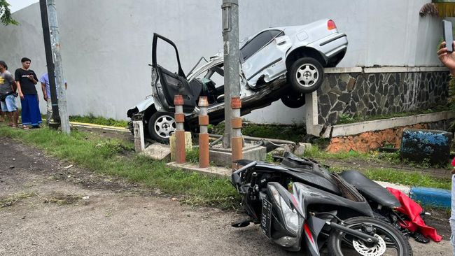 Sebuah mobil sedan meluncur deras menabrak motor yang berhenti saat lampu traffic light menyala merah di Pasuruan. Setelah menabrak motor, sedan meluncur deras menyasak tiang.