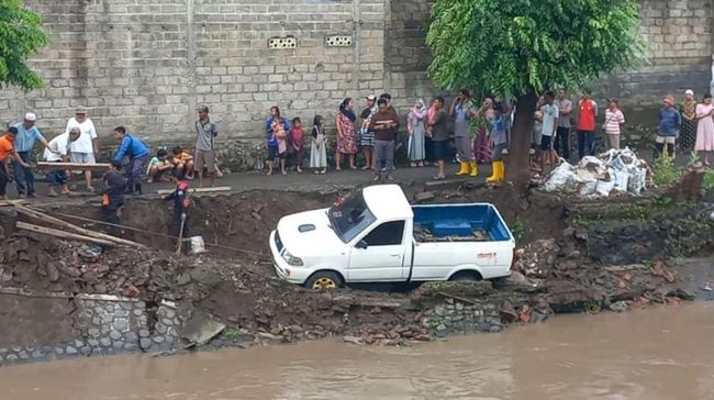 Plengsengan Sungai Gembong, Pasuruan, ambrol. Saat ambrol, ada sebuah mobil pikap parkir di atasnya. Mobil pikap warna putih itu jatuh ke sungai.