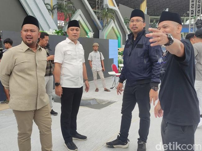 Bupati Sidoarjo Ahmad Muhdlor Ali, Bupati Gresik Fandi Akhmad Yani, dan Wali Kota Surabaya Eri Cahyadi tampak bersama-sama meninjau kesiapan perhelatan Puncak 1 Abad NU di GOR Delta Sidoarjo bersama-sama pada Minggu (5/2/2023) siang.