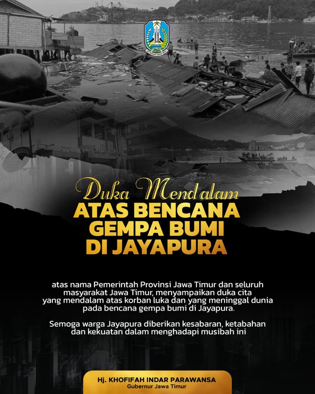 Gubernur Jawa Timur Khofifah Indar Parawansa menyampaikan belasungkawa mendalam atas gempa yang terjadi di beberapa wilayah di Papua, Kamis (9/2). Menurut Khofifah, duka akibat gempa yang menimpa Papua sekaligus menjadi duka yang dirasakan pula masyarakat Jawa Timur.