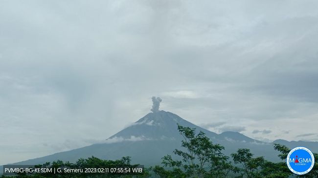 Gunung Semeru di Lumajang, kembali erupsi. Erupsi terjadi pukul 07.54 WIB, Sabtu (11/2/2023). Tinggi letusan 600 meter di atas puncak mahameru atau 4.276 meter di atas permukaan laut.